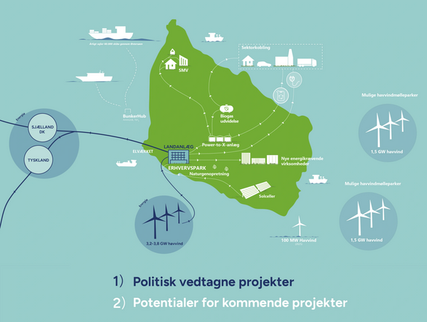 Energy Island Bornholm in the Baltic Sea will consist of two fields of offshore wind turbines, a high-voltage substation located on Bornholm and cables between the turbines, the substation and power receivers on Zealand and abroad.